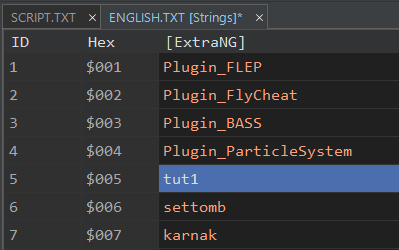 Because of how TRNG manages plugins, the names of any installed plugins are included as ExtraNG string entries. Hence, if you correctly installed this plugin, you are bound to have at least one NG string entry already occupied (or more, if you have more plugins installed or are using ExtraNG strings for other purposes). But it does not matter, we can add new ones easily. The layout of ExtraNG strings (if using TombIDE) can look something like this: