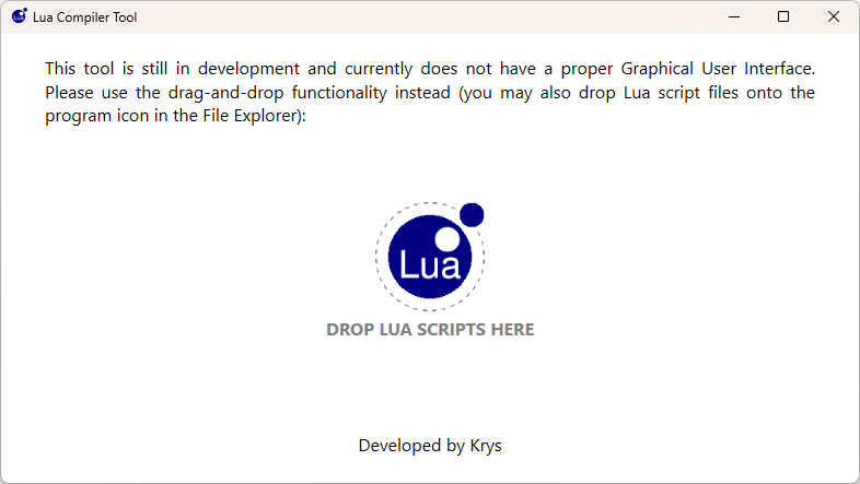 It has a simple drag-and-drop interface (either after launching the program and dropping the .lua files on the window, or directly onto the program EXE in File Explorer). The tool generates corresponding binary files out of the given Lua text files, in the same directory as the input files.