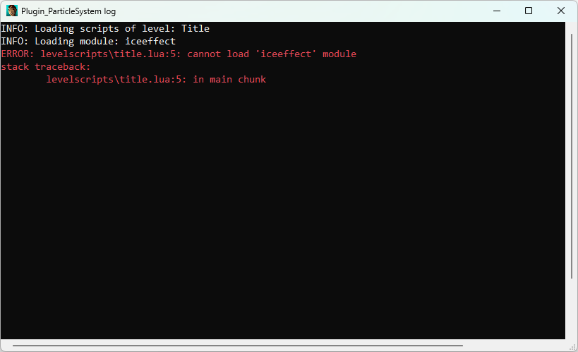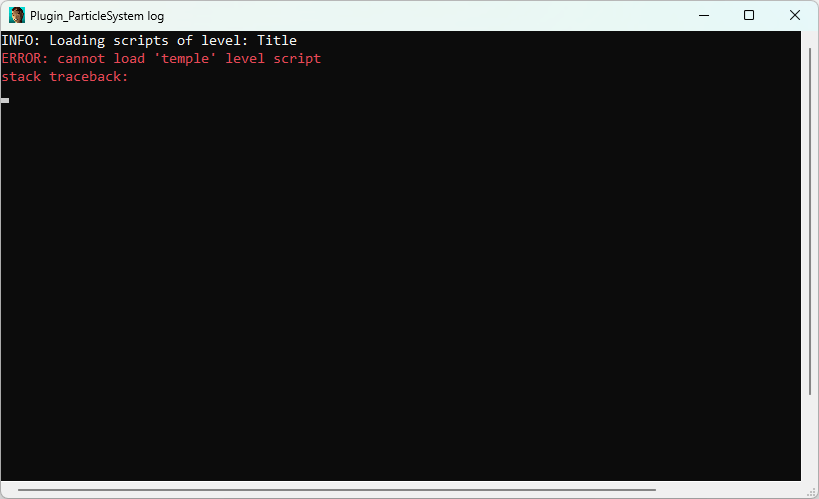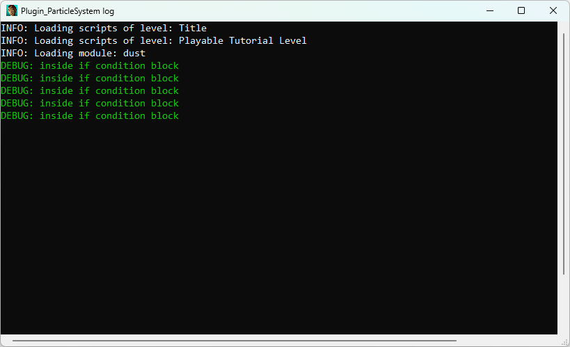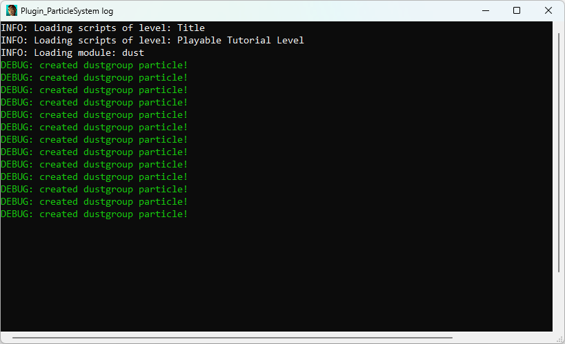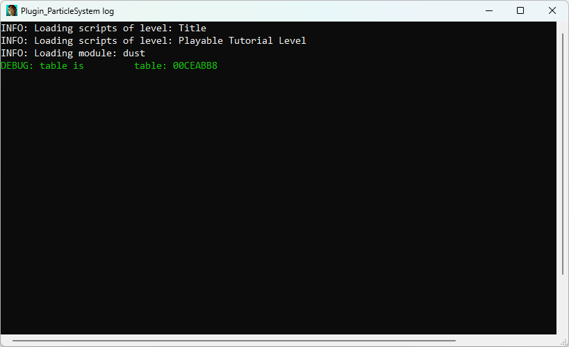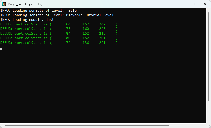 Where YYYYMMDD stands for the current date, and HHMMSS stands for the current system time on the PC, registered when the game is booted. These log files become available only after the game is closed and can be found in the working directory, where the Plugin_ParticleSystem.dll is present, alongside tomb4.exe. Though file dump logs do not allow to investigate the plugin behavior in real time, they are a more durable form of registering the plugin activity, which can later be examined at any time, or sent over to someone else (e.g. the plugin devs, in case of a suspected plugin bug). These text file logs are preferable to screenshots from the log console in such cases, as they give direct access to the text of each log message in chronological order. Here is a snippet showing example contents of a log text file: