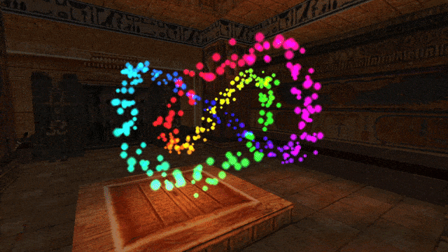 They are oscillating uniformly, though, all at the same time, since game tick values are uniform for each particle. We can also obtain a “spectrum scrolling” effect by including part.t in the picture. We rework the formula for hue, first multiplying part.t by 180, then adding getGameTick() on top of that:
