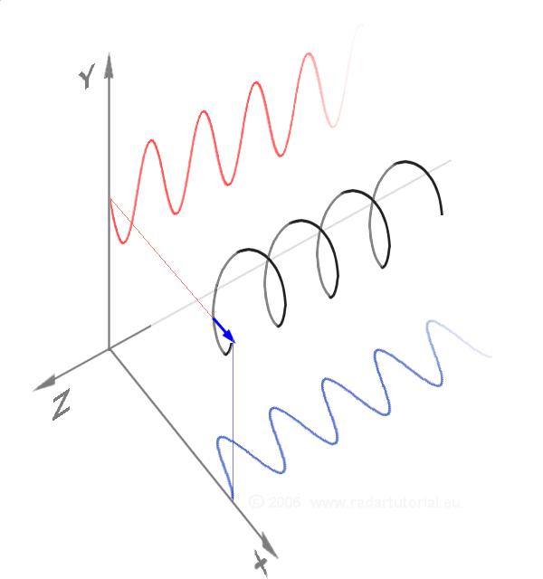 These waving particles are cool, but we can take it to the next level, by turning waves into helices or corkscrew shapes! Recall again the properties of sin() and cos(). I mentioned that these functions are phase-shifted in regards to each other. More specifically, sin(x) is π/2 radians “delayed” behind cos(x), thus cos(x) = sin(x + π/2). This phase-shift actually has a very neat origin / reason behind it. Take a look at the animated diagram below: