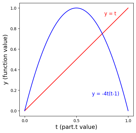 The parabola is 0 at t = 0 and t = 1 and reaches a peak of 1 at t = 0.5. We translate this computation to Lua, with part.t taking the place of t, and save the result to an extra variable shape: