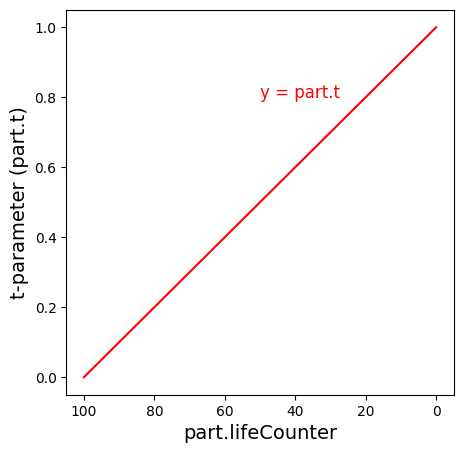 Okay, that’s great and all, but what would this t-parameter even be useful for? Well, picture the following situation. You would like another particle property, like its size, color or velocity, to depend on this “lifestage” value in some way. It’s always in the known range of 0.0 to 1.0 (unlike part.lifeCounter values, which are integers and aren’t always uniform form one particle to the next, due to various life spans). The t-parameter grows linearly with time (while lifeCounter values go down), reflecting the particle “progressing” its life-span. If you’re more of a visual learner, here is a graph of the t-parameter values, plotted against lifeCounter values of a particle with lifeSpan set to 100.