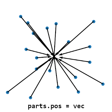 Also, consider that you may have particles spawned in with slightly random offsets in the init function. If we overwrite the position directly in update, we lose information of what this random offset was. But velocity will preserve this offset, as it adds itself on top of what was already stored in the position vector. This is what makes setting velocity preferrable to setting position in the overwhelming majority of cases, as the original starting point of the particle remains untouched. Look at these diagrams to see the difference between setting position and setting velocity in update: