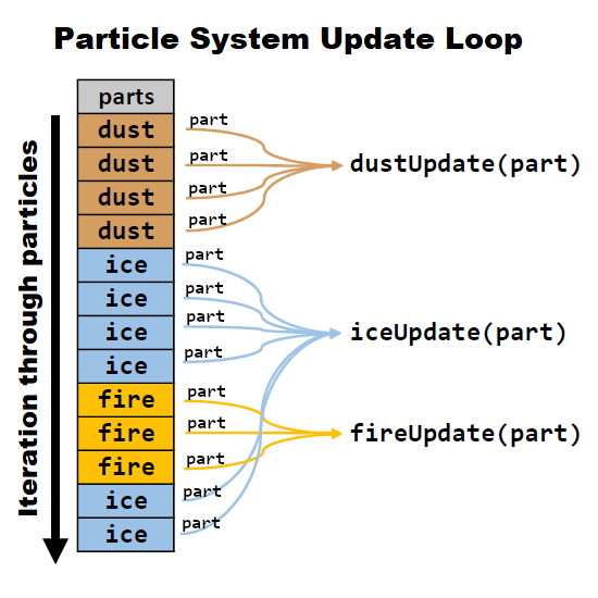 Anyway, what purpose does the argument part serve to dustUpdate()? Simply put, part is one of the particles belonging to the group. During each in-game frame, the particle system iterates through all currently existing particles and, on top of performing generic updates to each of those particles (like updating their positions or decreasing their life counters), it calls the update function we assigned to the group (unless nil was used in its place, that is), passing the current particle through the part argument.
