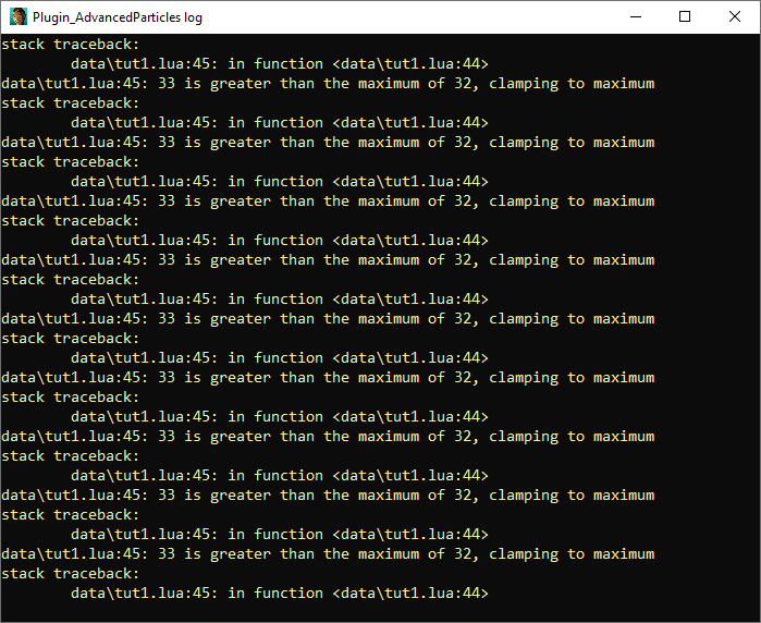 Indeed, all of the particles animate through the sprite textures, but only once, then they stop at the last texture! Not only that, but if we enable the console to see what’s going on behind the scenes, we’re being bombarded with warning messages: